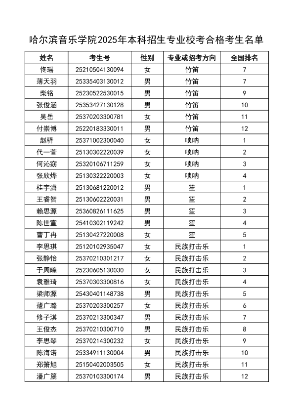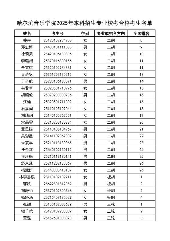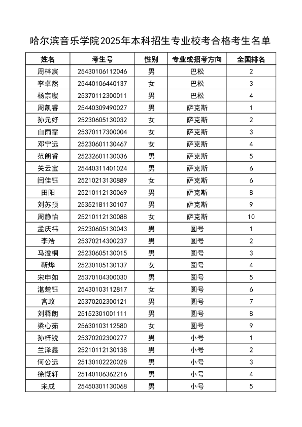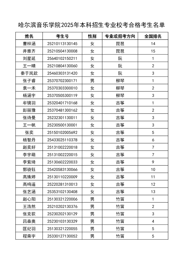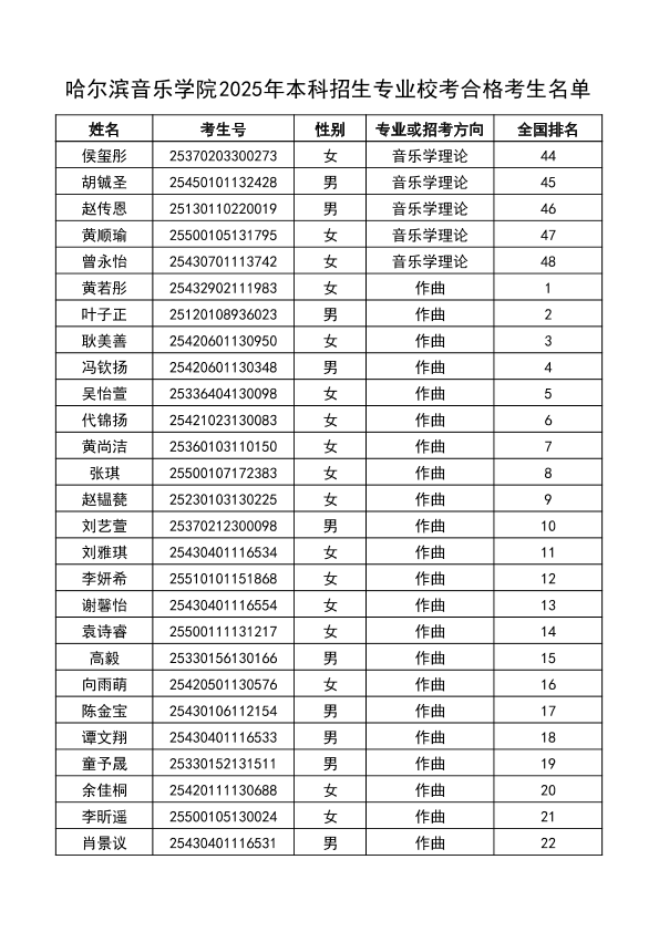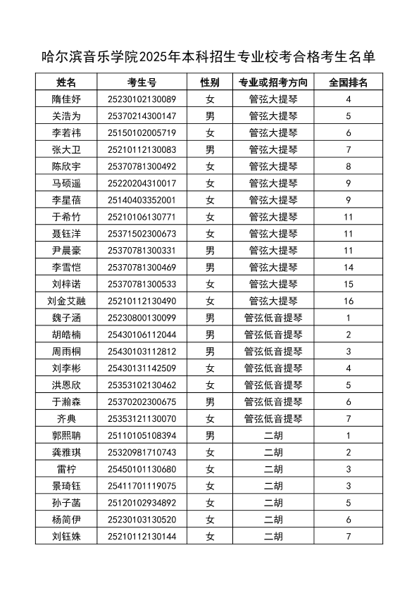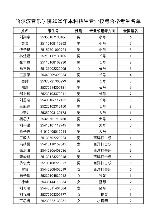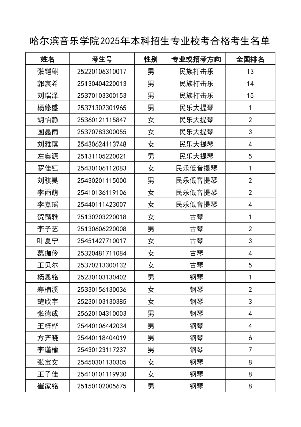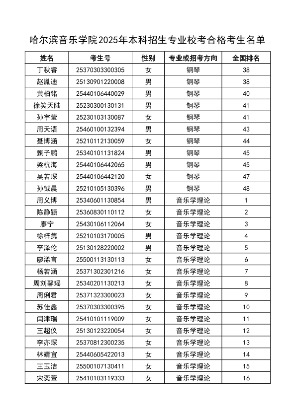 根据《哈尔滨音乐学院2025年本科招生简章》要求,按照学校2025年本科专业校考相关规定,现将我校2025年本科招生专业校考合格分数线及合格考生名单公布如下(见附件1、2)。
