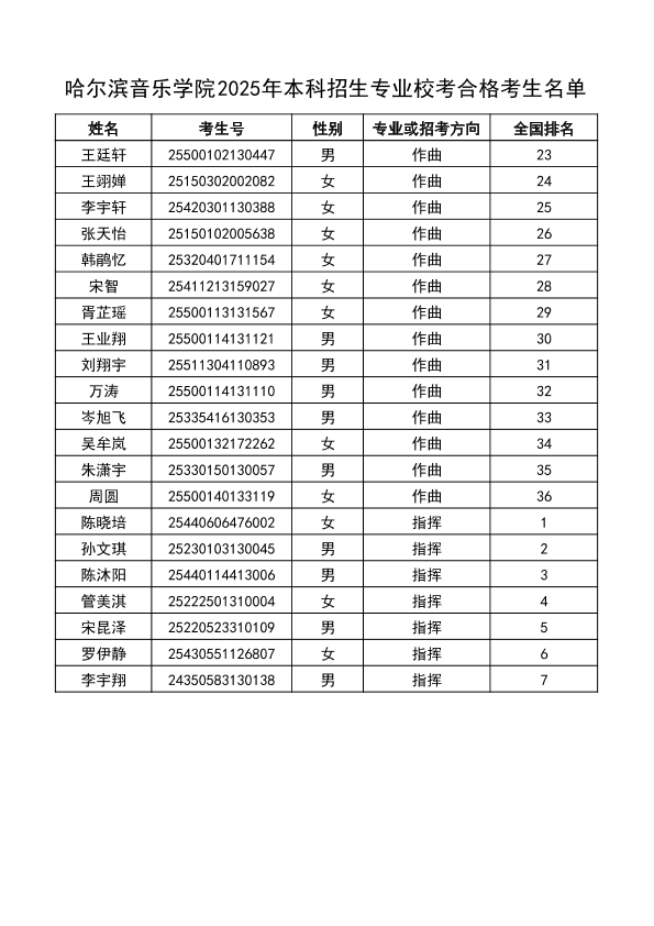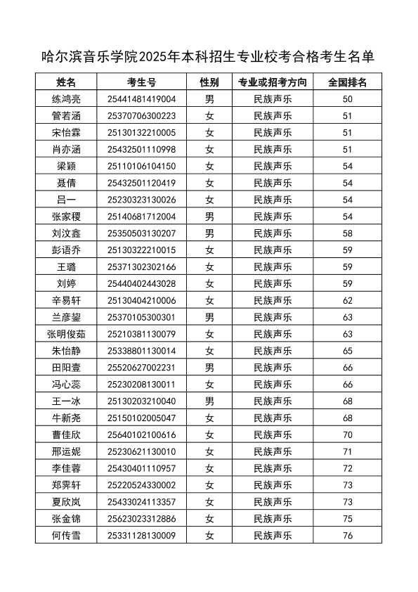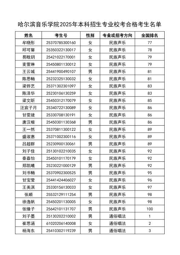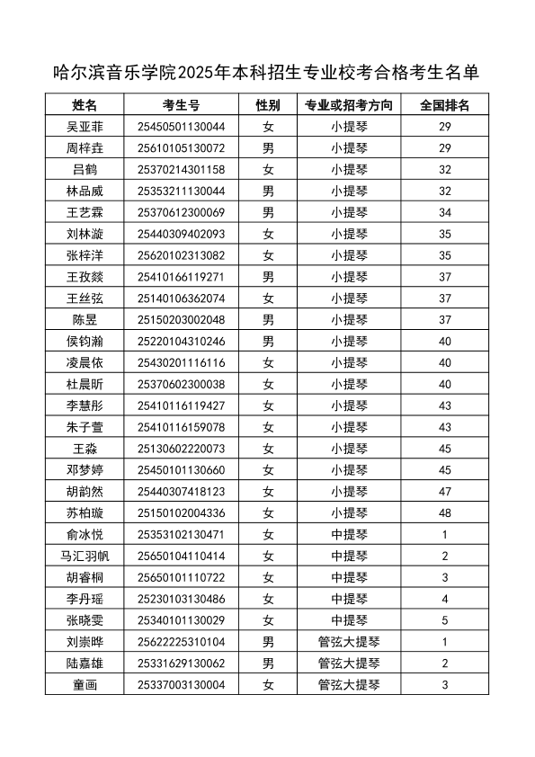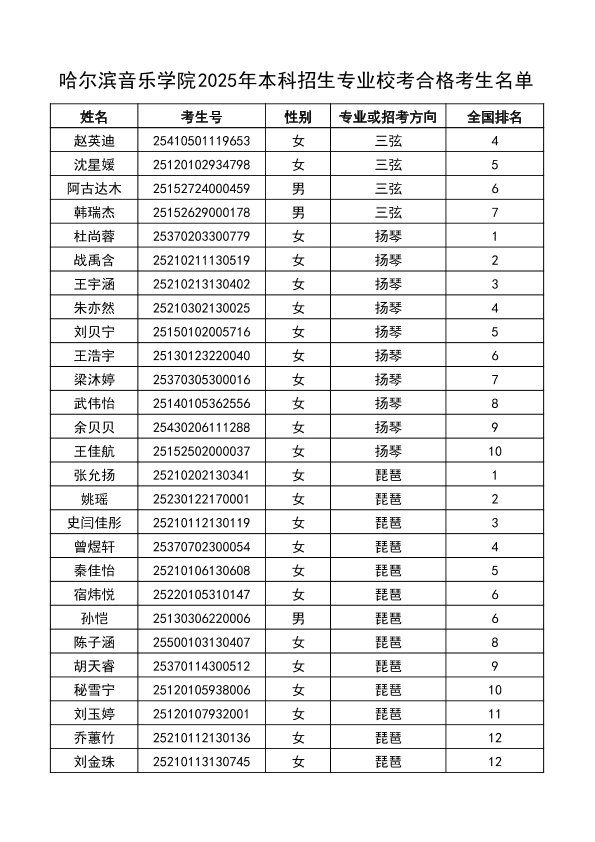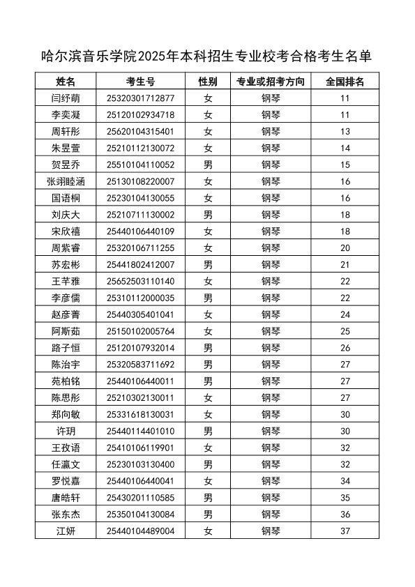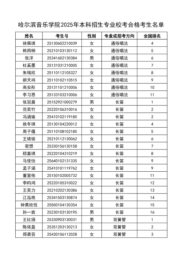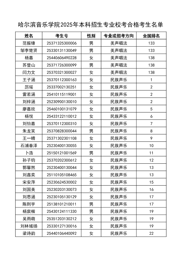 根据《哈尔滨音乐学院2025年本科招生简章》要求,按照学校2025年本科专业校考相关规定,现将我校2025年本科招生专业校考合格分数线及合格考生名单公布如下(见附件1、2)。