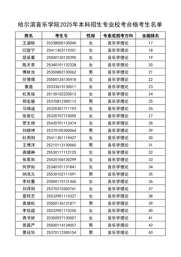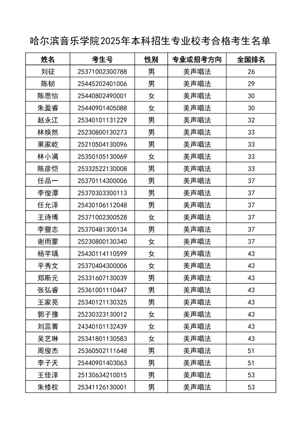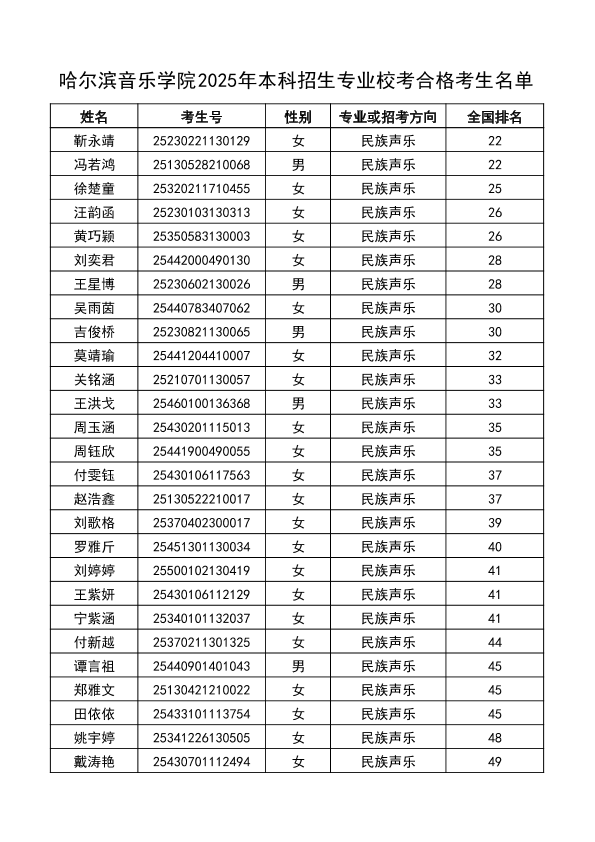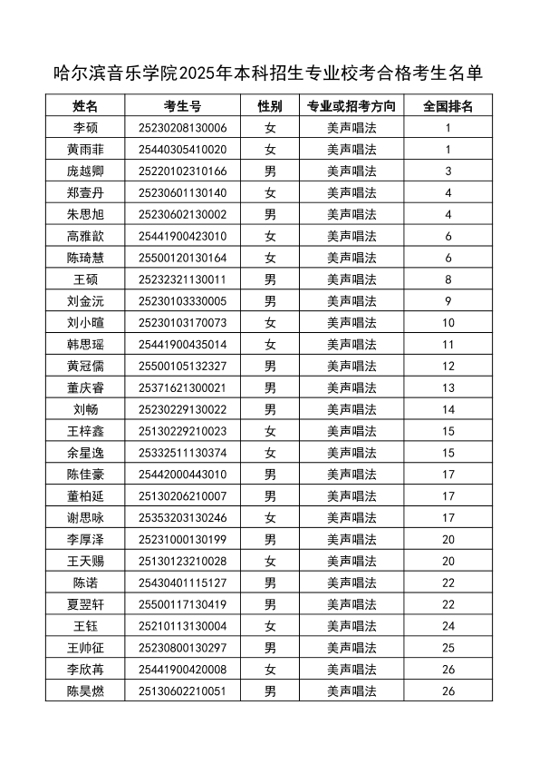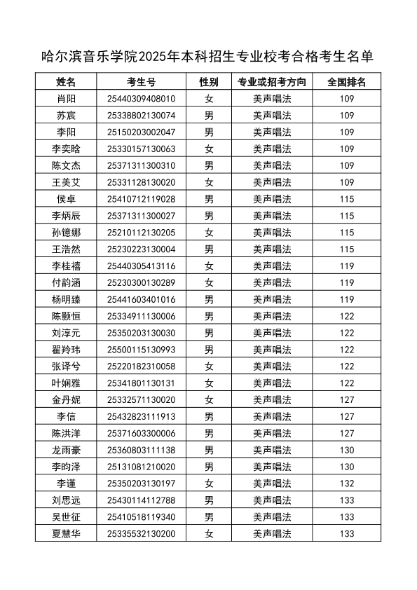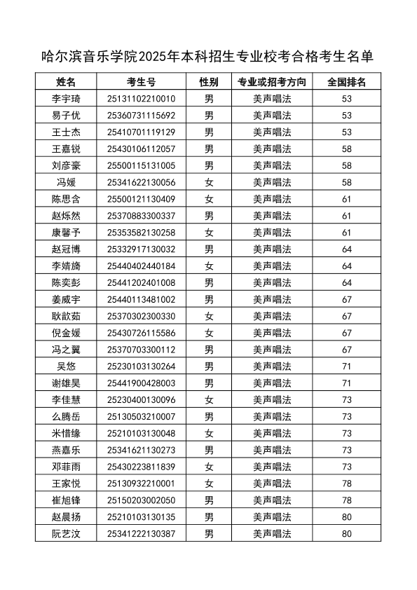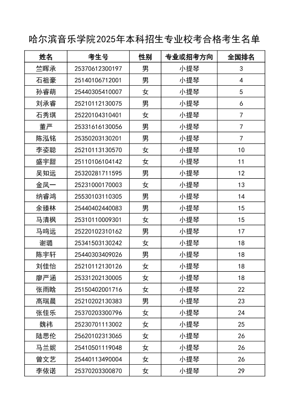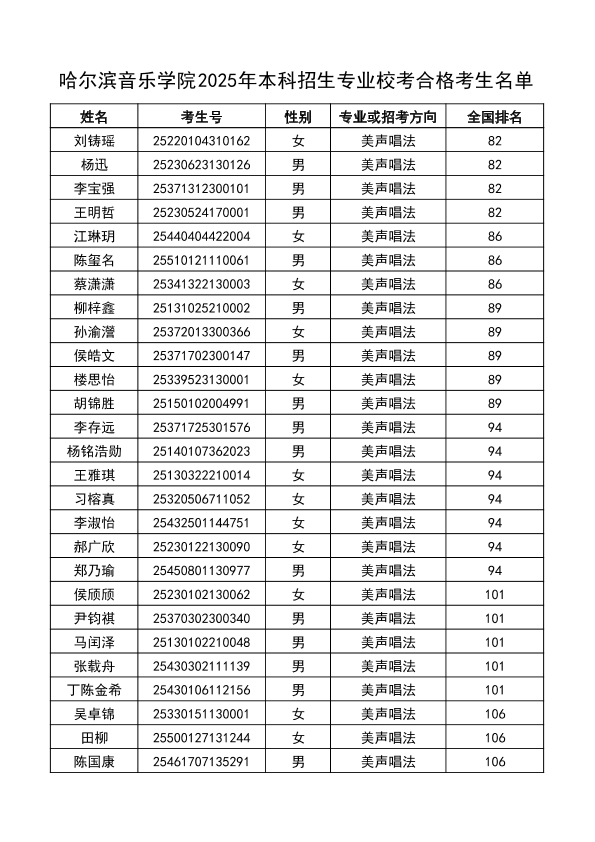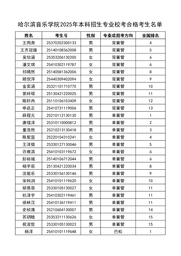 根据《哈尔滨音乐学院2025年本科招生简章》要求,按照学校2025年本科专业校考相关规定,现将我校2025年本科招生专业校考合格分数线及合格考生名单公布如下(见附件1、2)。